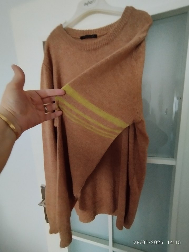 Kahverengi, örgü yün kazak, bisiklet yaka ve uzun kolludur. Salaş kesim, normal midi boyda, desen içermeyen rahat sokak tarzına uygundur.