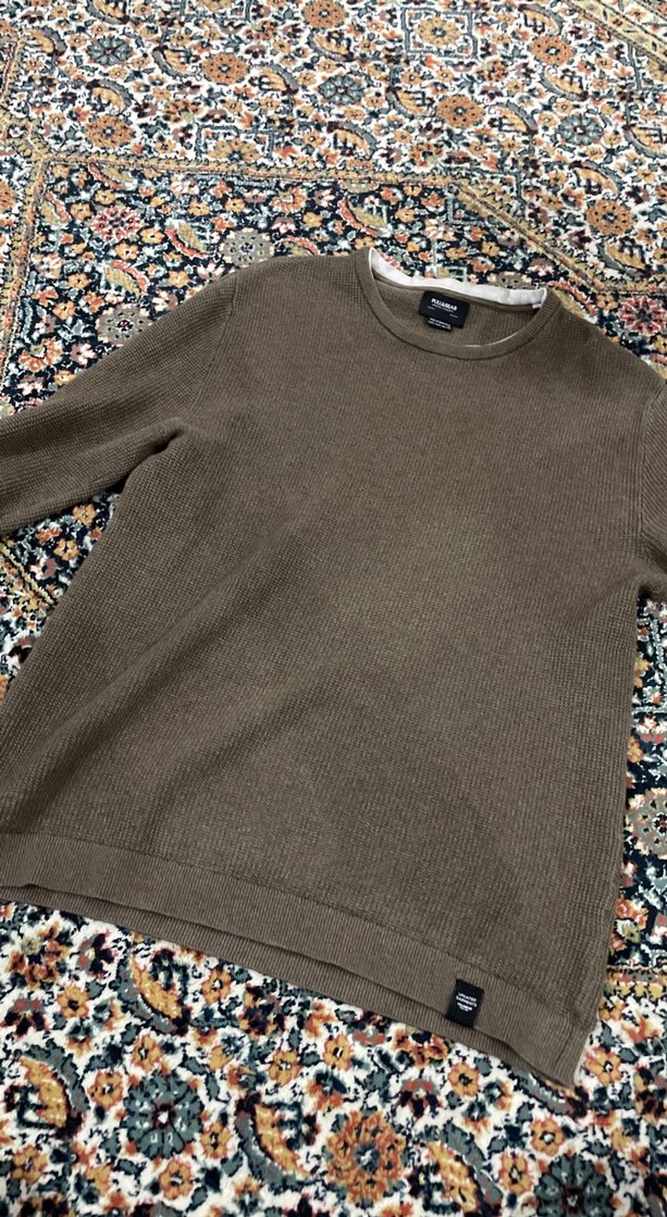 Erkekler için uzun kollu, yuvarlak yakalı, kahverengi triko kumaştan, bol kesim, desen içermeyen, günlük kullanıma uygun kazak.