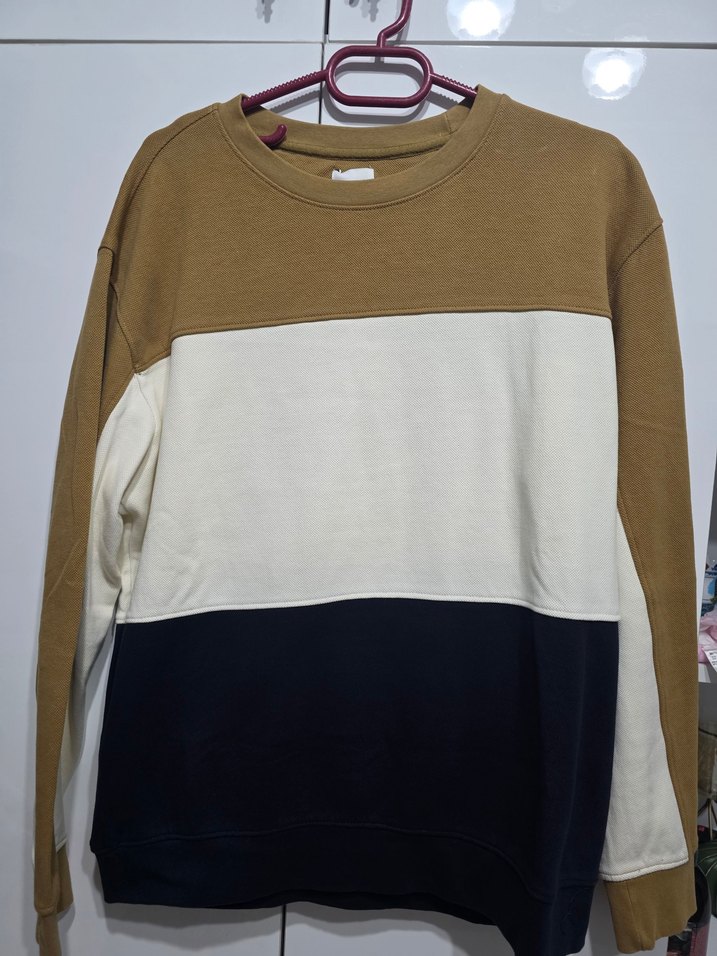 Erkekler için kahverengi, beyaz ve lacivert renk bloklu, örme, uzun kollu ve bisiklet yakalı rahat kesim sweatshirt. Günlük kullanım için uygundur.