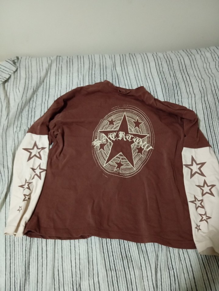 Kahverengi uzun kollu erkek gömleği, bol kesim ve göğüs ile kollarda baskılı yıldız desenine sahiptir. Pamuk kumaştan üretilmiş, düğme detaylı ve yuvarlak yakalıdır. ⭐