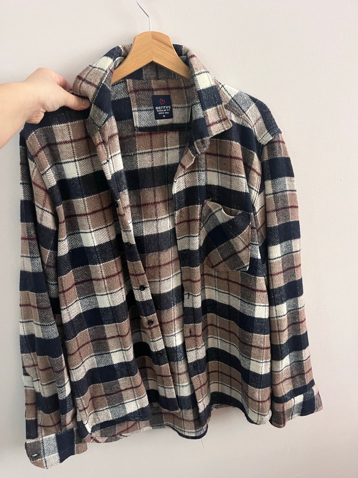 Düğmeli, uzun kollu, yaka detaylı erkek gömleği. Bol kesim, normal uzunlukta ve yün kumaştan. Koyu kahverengi kareli desene sahip, gündelik kullanım için uygun. Ürün M bedendir.