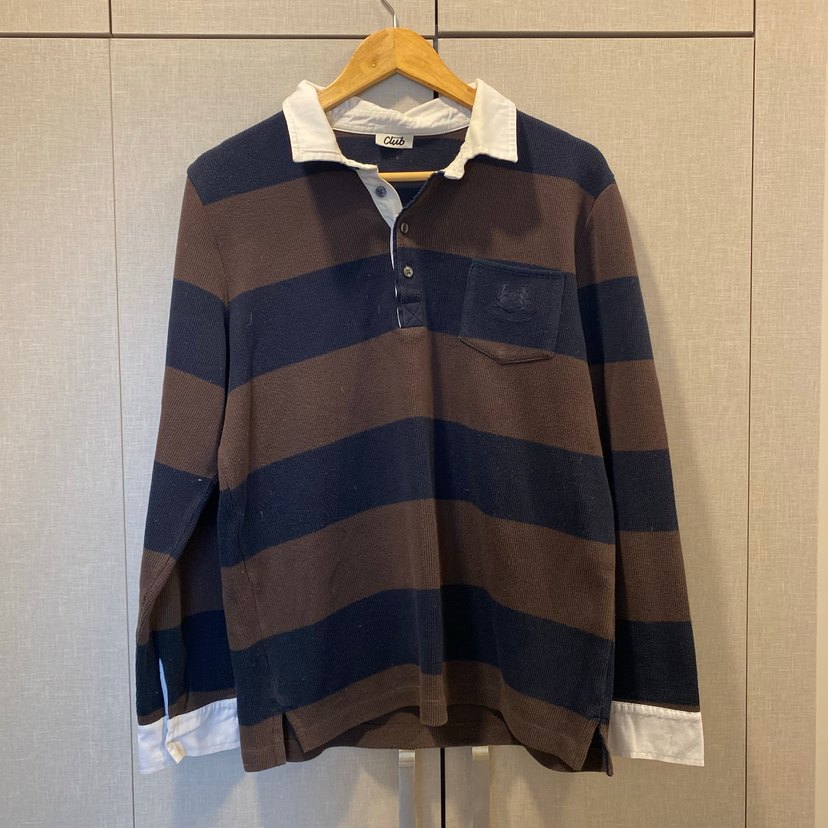 Erkek uzun kollu polo tişört, düğmeli ve yakalıdır. Gevşek kesimi ve koyu kahverengi-lacivert çizgili deseni vardır. Yumuşak ve sıcak kumaştan üretilmiştir.