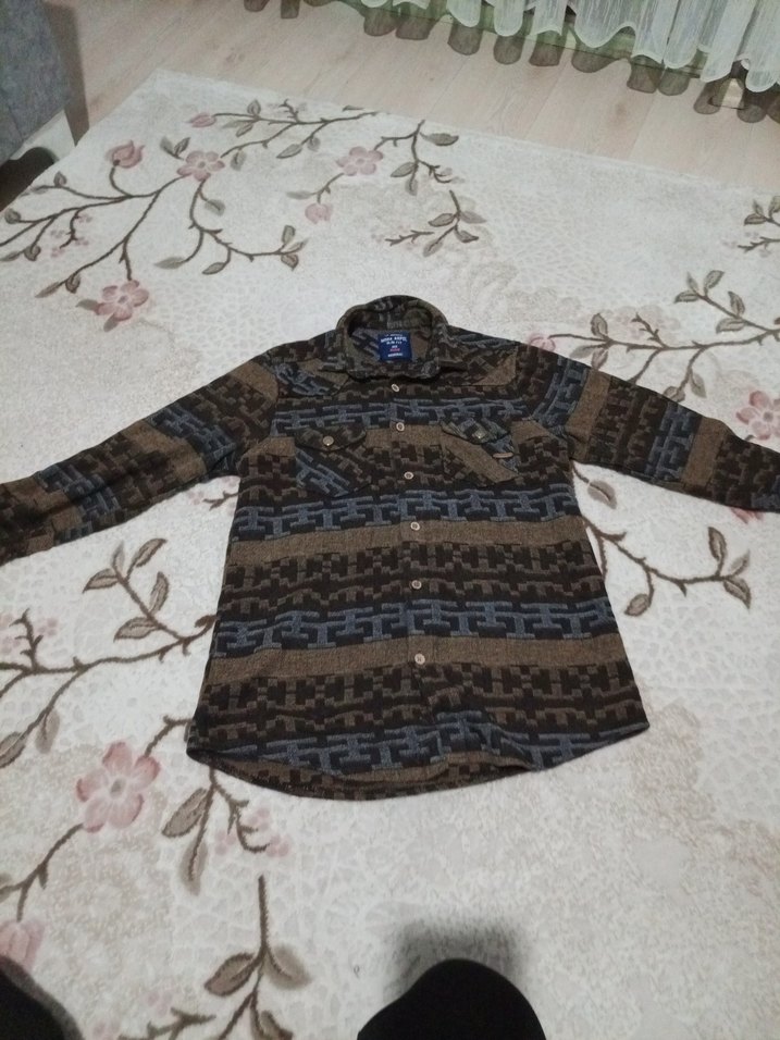Erkekler için düğmeli, yaka detaylı, yumuşak yün kumaştan yapılmış kahverengi uzun kollu gömlek. Salaş kesimi ve koyu renk batik deseniyle günlük kullanıma uygundur.