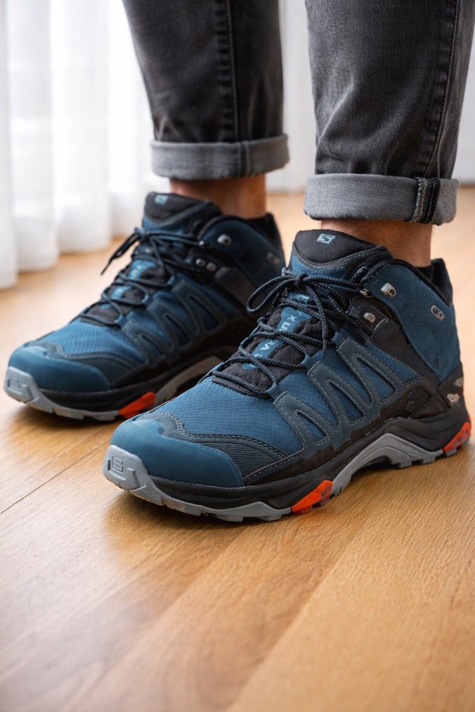Bağcıklı tasarıma sahip erkek outdoor ayakkabılar, mavi ve gri kamuflaj desenlidir. Dayanıklı kauçuk tabanlı, spor ve sokak stili uyumlu.