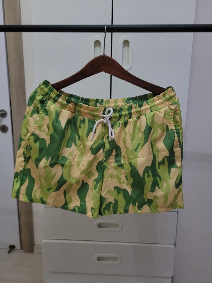 Renkli,bohem ,fileli ,bağlama desenli, bol kesim mavi deniz şortu, plaj için uygun. herhangi bir defo Sökük yırtık yoktur M L bedene uyar. Boohoman marka