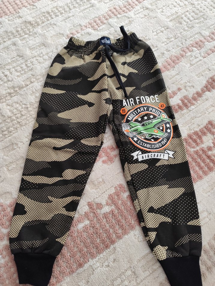 kamuflaj desenli, bol kesim erkek eşofman. Yumuşak ve sıcak kumaştan. 2-3 yaş uygun hic giyilmedi içi polar sıcak tutar.