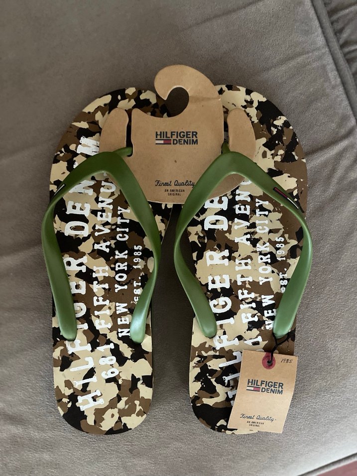 Kauçuk malzemeden yapılmış, koyu kahverengi kamuflaj desenli ve tokalı erkek terlik. Casual sokak stili için uygundur. HILFIGER markalı.