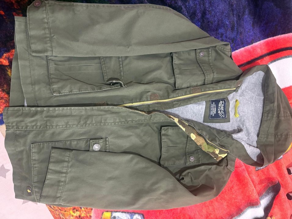 Erkekler için kamuflaj desenli, normal boy midi ceket. Notlu yaka, fermuarlı ve bol kesimdir. Uzun kollu, sentetik kumaştan, dış mekan kullanımı için uygundur.