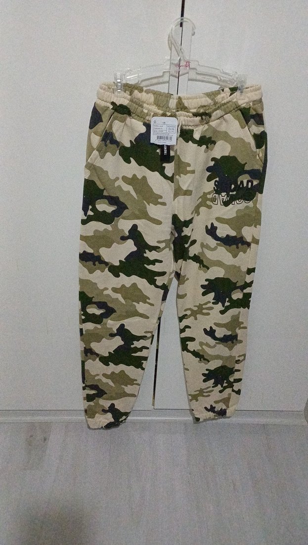 Hafif haki kamuflaj desenli, yumuşak kumaştan, rahat kesim erkek pantolon. uzun boy, dış mekan kullanımı için uygun, spor ve sokak stiliyle uyumlu.