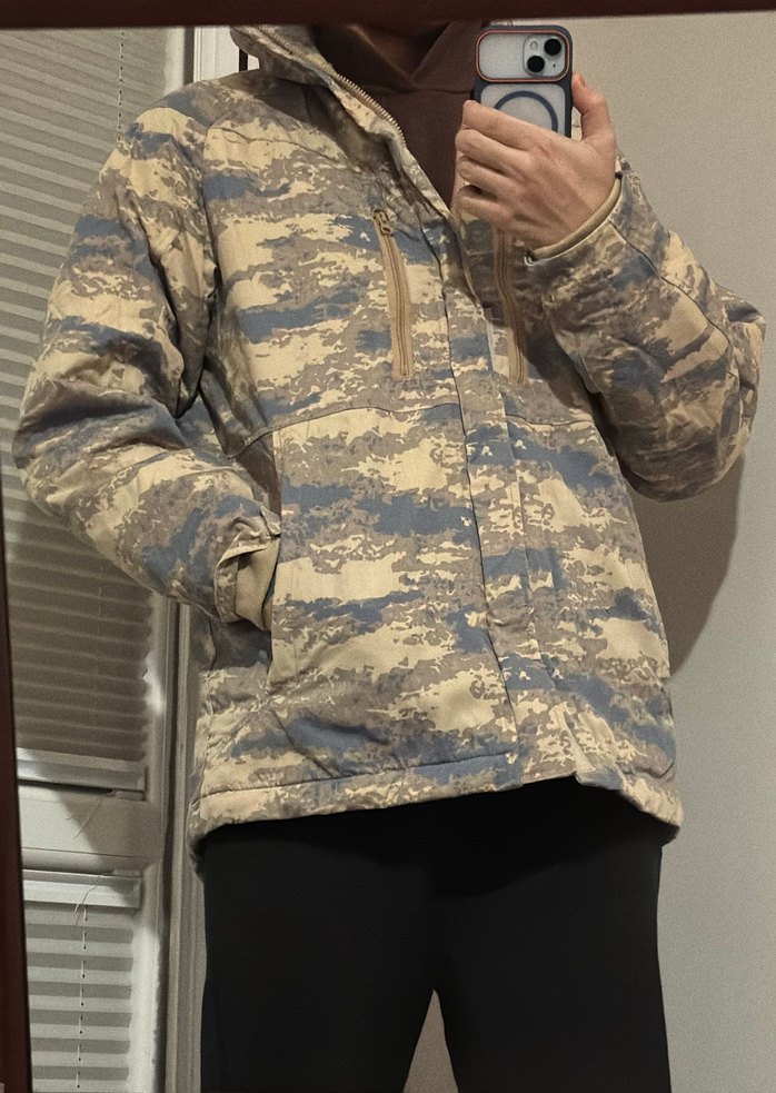 Erkekler için kamuflaj desenli, , yüksek yakalı ve uzun kollu mont. Sentetik kumaştan, fermuarlı ceplidir. Az kullanıldı sıcak tutuyor fermuarında sıkıntı var tam açılmıyor sıkışıyor ufak bir tadilata ihtiyacı var orijinal TSK askeriye montu