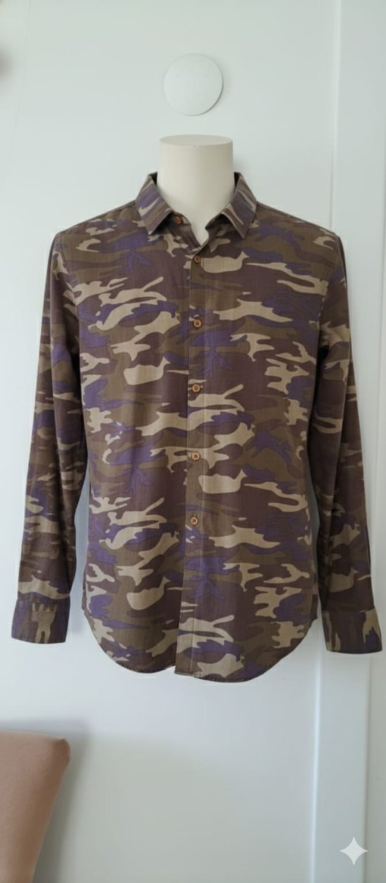 Bu erkek gömlek, kahverengi kamuflaj desenli, uzun kollu ve yakalıdır. Düğmeli ön kısmı ve normal kesimiyle günlük rahat sokak tarzına uygundur. Sentetik kumaştan, koyu tonda üretilmiştir.