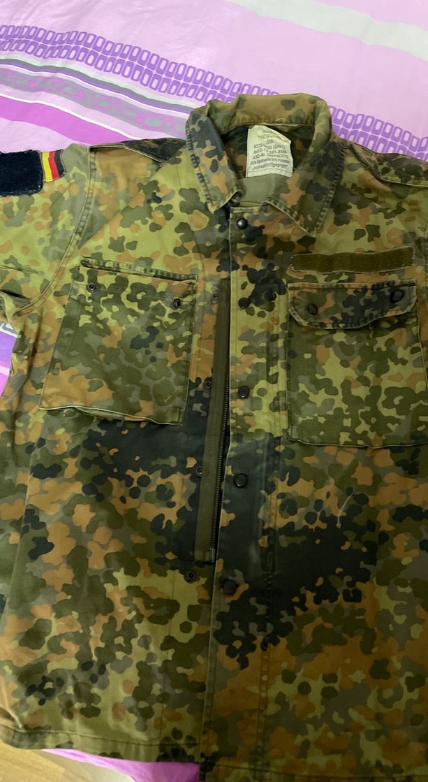 Erkekler için koyu haki kamuflaj desenli, düğmeli, uzun kollu, normal boyda ve bol kesim sentetik kumaş ceket. Dış mekan kullanımı için uygundur.