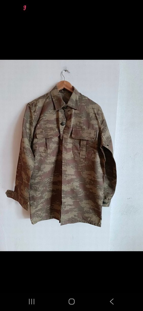 Gri ve kahverengi kamuflaj desenli, düğmeli ve cepli, uzun kollu, bol kesim erkek gömleği. Günlük kullanıma uygun rahat bir tekstil ürünü.