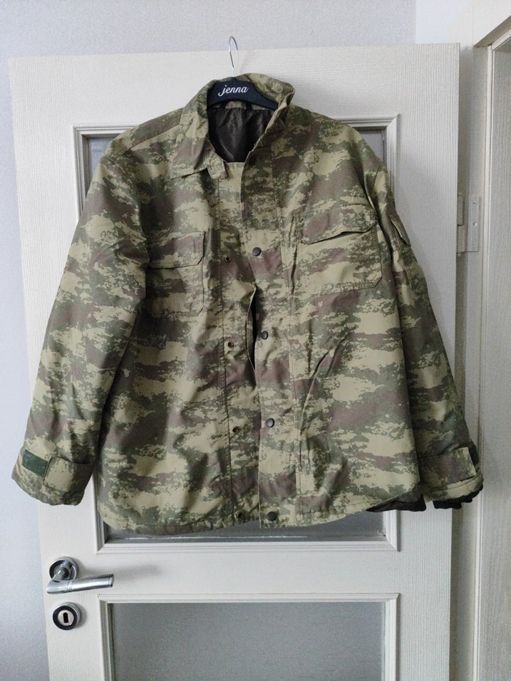 Erkekler için kamuflaj desenli, düğmeli ve kesimli yaka detaylı sokak tarzı mont. Gevşek kesim, uzun kollu ve sentetik kumaştan, kahverengi ve gri tonlarda, dış mekan için uygundur.