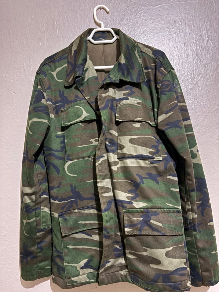 Erkekler için kamuflaj desenli, düğmeli, normal boyda, notched yakalı cep detaylı ceket. Uzun kollu ve rahat kesimdir, outdoor ve street style için uygundur. Arka kısmında cözgu kaciklari mevcuttur. Görsellere eklenmiştir. L bedendir fakat beden etiketi yoktur.