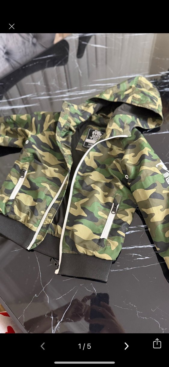 Erkekler için koyu yeşil kamuflaj desenli, bol kesim ve fermuarlı ceplere sahip ceket. Notlu yaka ve kapüşonlu, sentetik kumaştan üretilmiştir. Hediye geldi hiç giyilmedi