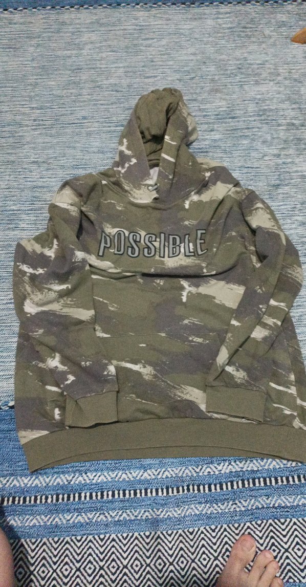 Gri kamuflaj desenli, kapüşonlu ve uzun kollu, bel kemerli erkek sweatshirt. Önünde "POSSIBLE" yazısı bulunmaktadır.