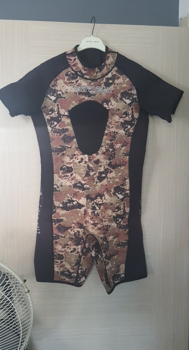 Koyu kahverengi kamuflaj desenli, kısa kollu ve kemerli erkek fitted mayo, açık hava kullanımı için uygundur. ♂️