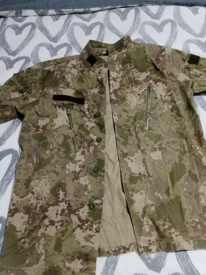 Erkekler için bol kesim uzun kollu, düğmeli, yaka tipi kesik yakalı kamuflaj desenli sentetik kumaş gömlek. Outdoor ve günlük kullanıma uygun.