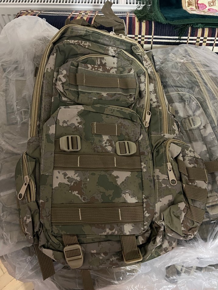 Erkekler için kamuflaj desenli, koyu haki renkte, çoklu tokalı ceplere sahip sırt çantası. Sokak stili için uygun, kullanışlı ve dayanıklı tasarım.