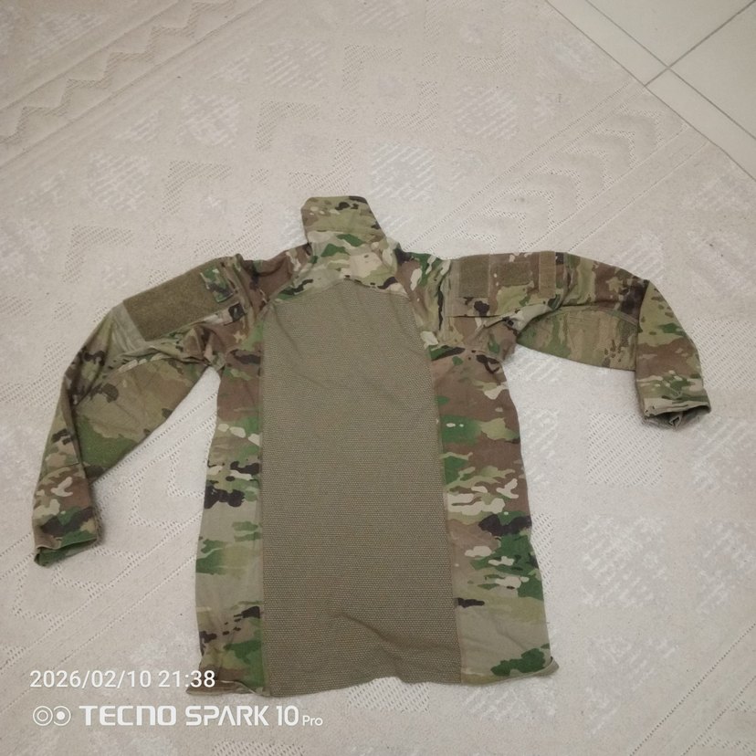 Sentetik kumaştan, bol kesim, yüksek yakalı ve uzun kollu erkek gömleği. Açık kahverengi kamuflaj deseni ve cırt cırt detayları bulunur. Outdoor kullanıma uygundur.