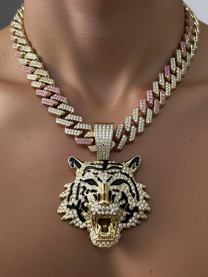 Uzun altın renkli zincir kolye, cesur kaplan başı figürü ve yılan desenli detaylarla süslenmiş, gösterişli sokak tarzına uygun.