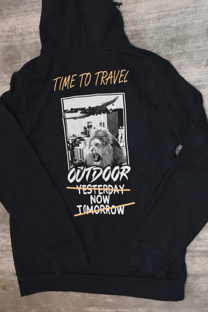 Erkekler için lacivert kapüşonlu sweatshirt, bol kesim ve uzun kolludur. Yumuşak ve sıcak fleece kumaştan üretilmiş, fermuarlı ve sırtında seyahat temalı baskılar bulunur.