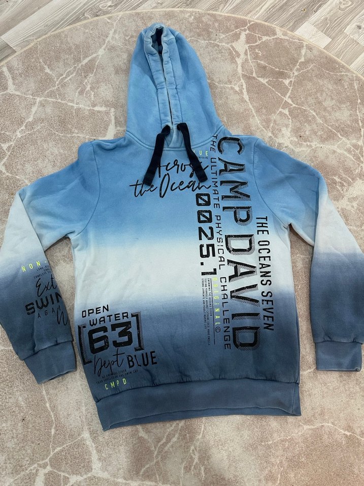 Erkekler için kapüşonlu ve fermuarlı, bol kesim, mavi ve gri tonlarda baskılı sweatshirt. Yumuşak ve sıcak kumaştan üretilmiştir, trend sokak stili için uygundur.