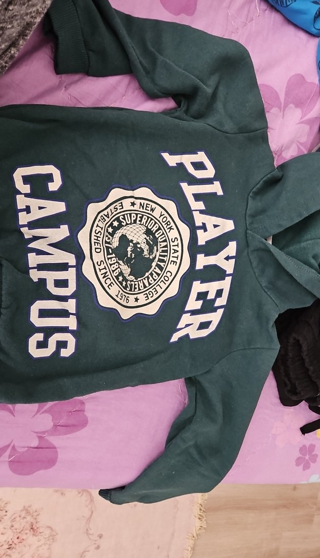 Koyu yeşil renkli, kapüşonlu ve fermuarlı erkek sweatshirtü, uzun kollu ve baskılı kampüs desenlidir.