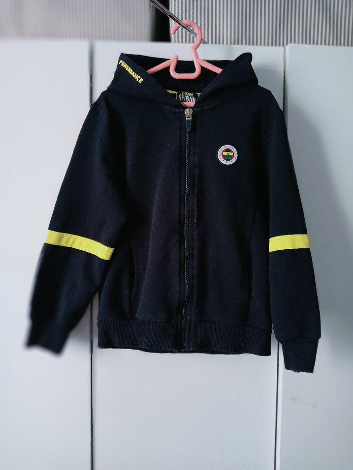 Bu erkek kapüşonlu sweatshirt, fermuarlı ve fitted kesime sahiptir. Yumuşak ve sıcak kumaştan üretilmiş, uzun kollu ve sarı baskılı şerit detaylıdır. Trendy günlük stil için uygundur.