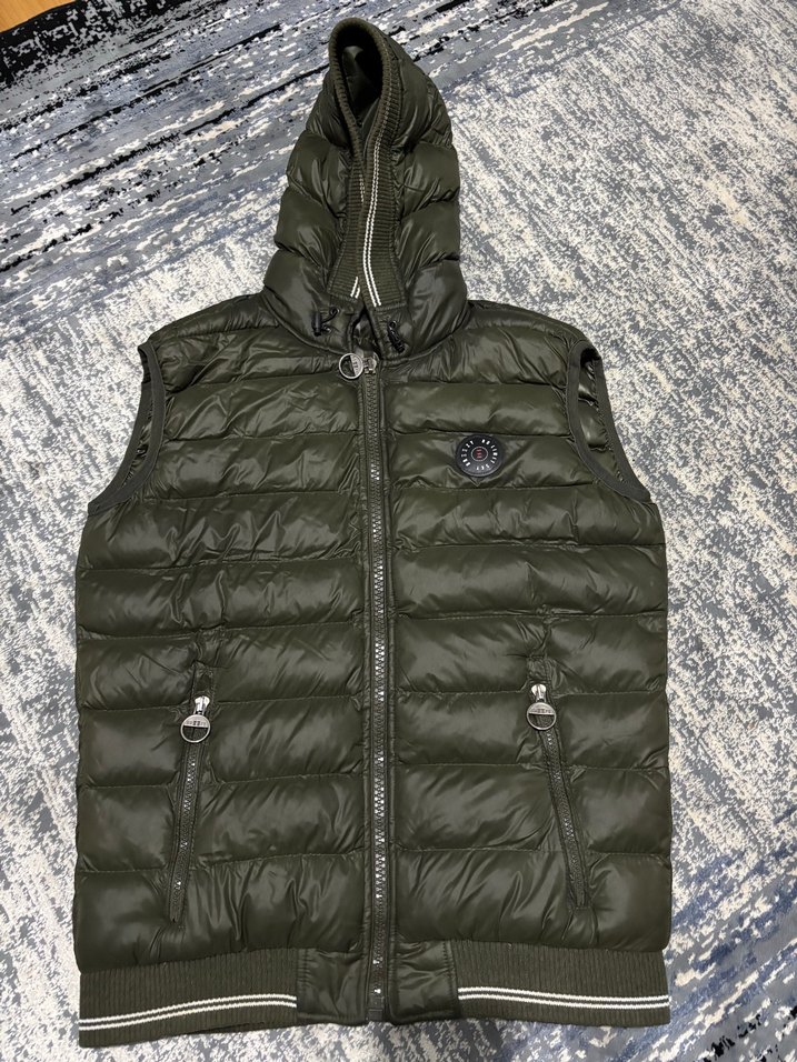 Erkekler için kapüşonlu, fermuarlı ve kolsuz yelek. Yumuşak dolgulu kumaş