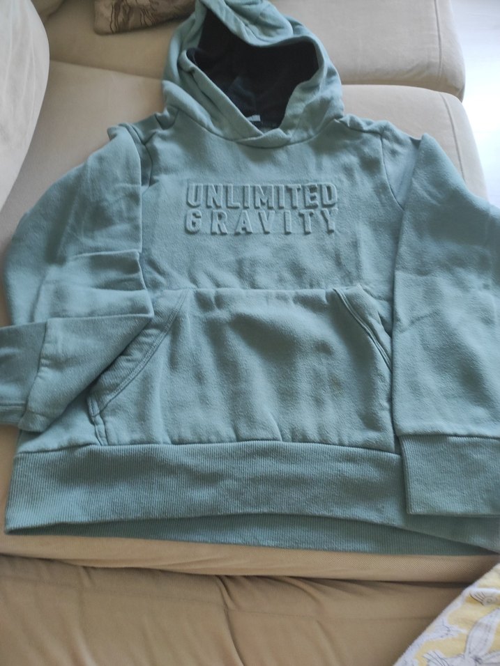 Erkekler için gri kapüşonlu sweatshirt, rahat kesim ve uzun kollu, yumuşak ve sıcak kumaştan. Önünde "UNLIMITED GRAVITY" kabartmalı sade tasarım sunar. az kullanıldı hiç bir defosu renk solması yoktur 10/11 yaş