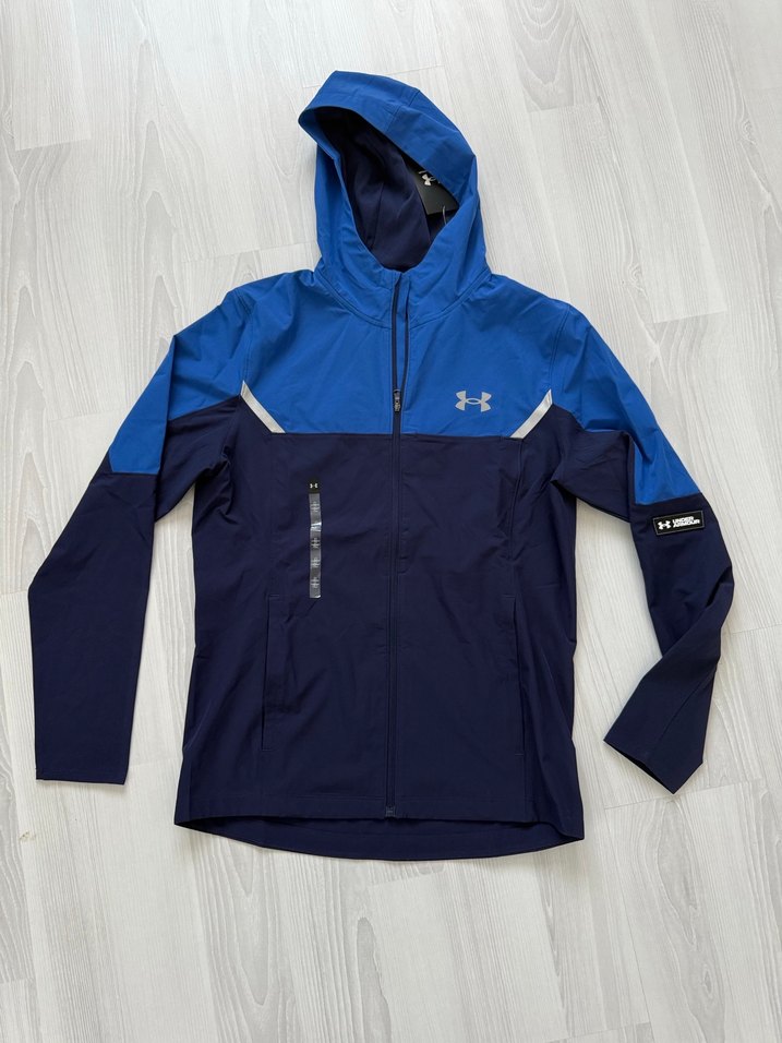 Erkekler için kapüşonlu, uzun kollu ve dar kesimli mavi rüzgarlık. Sentetik kumaştan üretilmiş, fermuarlı ve dış mekan kullanımı için uygun.