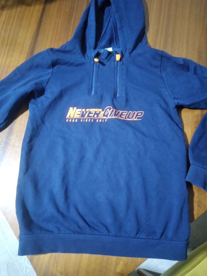 Erkek çocuklar için uzun kollu, yuvarlak yakalı, bol kesim ve parlak baskılı mavi sweatshirt. Yumuşak ve sıcak kumaştan, fermuarlı detaylı. Önde 'NEVER GIVE UP' yazısı var.