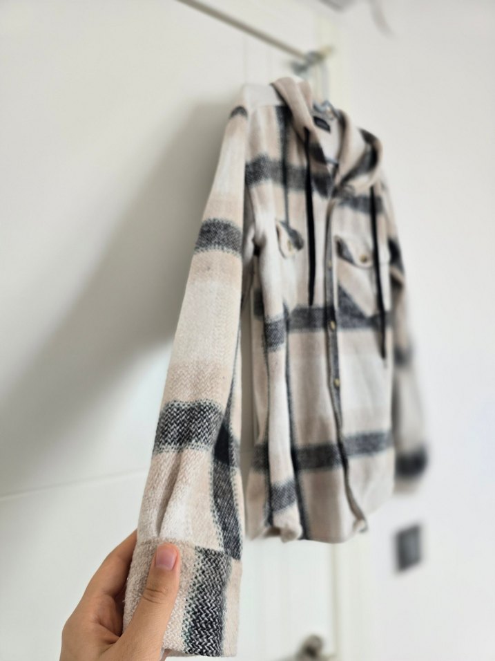 Düğmeli, uzun kollu, erkek kapüşonlu oduncu gömlek. Bej ve gri tonlarda, notched lapel yakalı, yumuşak sentetik kumaştan üretilmiştir.