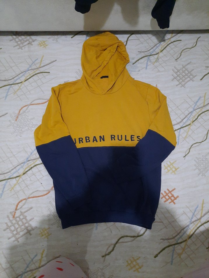 uzun kollu, bol kesim, bisiklet yaka sweatshirt. Sarı ve lacivert renk bloklu, göğüste "URBAN RULES" baskılı, yumuşak ve sıcak kumaştan üretilmiştir.
