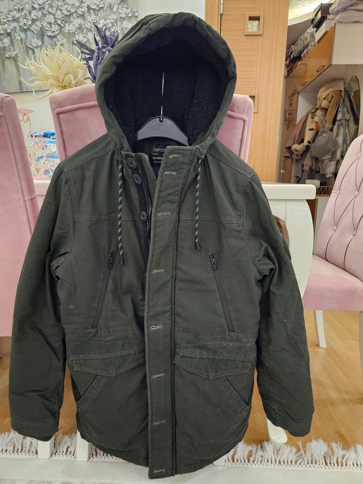 Haki renkli düğmeli ve kapüşonlu erkek montu. Rahat kesimli, yumuşak ve sıcak kumaştan yapılmıştır. Çok cepli ve notched yaka detaylıdır.
