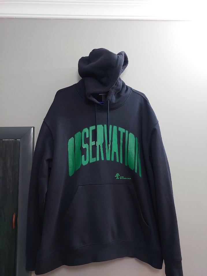 Uzun kollu, kapüşonlu ve bol kesim olan koyu yeşil sweatshirt, üzerinde 'OBSERVATION' baskısı bulunur. Yumuşak ve sıcak kumaştan yapılmıştır.