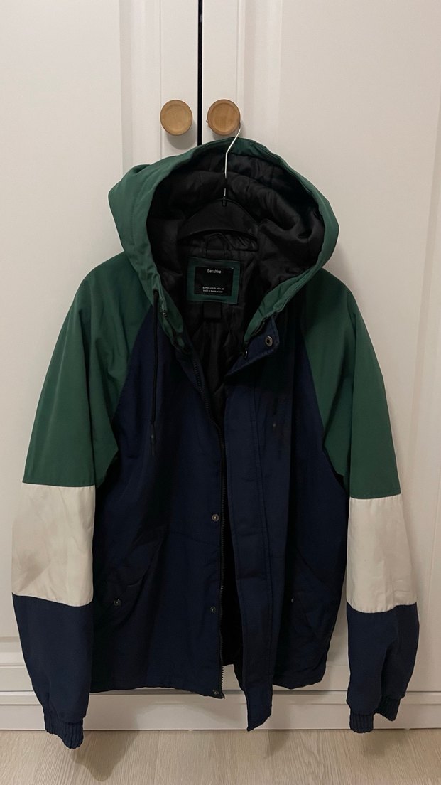 Yeşil ve koyu mavi renklerde, düğmeli, kapüşonlu, uzun kollu, bol kesim erkek montu. Yumuşak ve sıcak kumaştan yapılmıştır, günlük kullanım için uygundur.