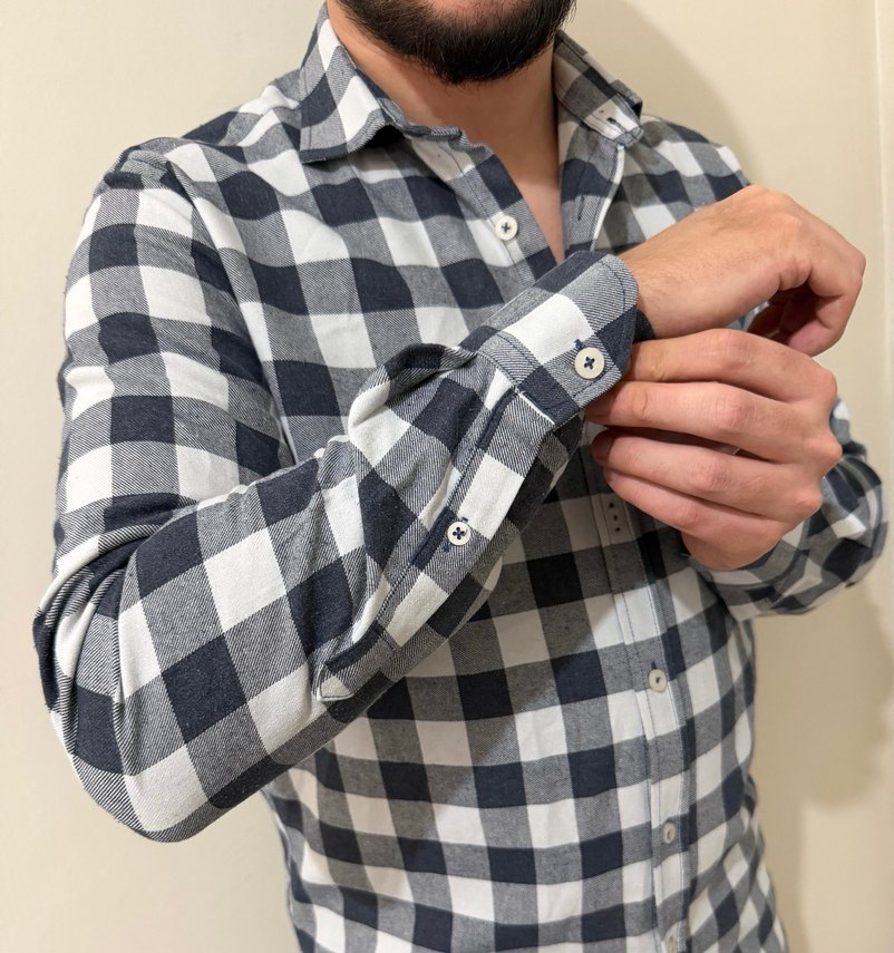 Pamuk kumaştan yapılmış, düğmeli, kareli, normal boy uzunluğunda, uzun kollu erkek gömleği. Günlük ve sokak stiline uygun.