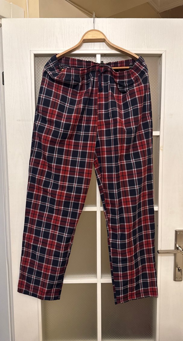 Erkek pijama altı, koyu renkli çok renkli kareli desenli, kemerli ve rahat regular fit kesime sahip. Sokak giyimine uygun rahat bir parça. Beli-47 cm, uzunluğu-106 cm, paçaları-20 cm