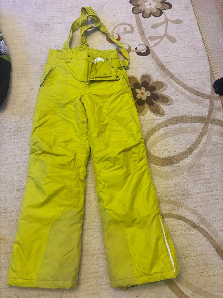 Bol kesim, kemerli ve askılı erkek kayak pantolonu, sentetik kumaştan, dış mekan kullanımı için uygun,. 9_12 yas