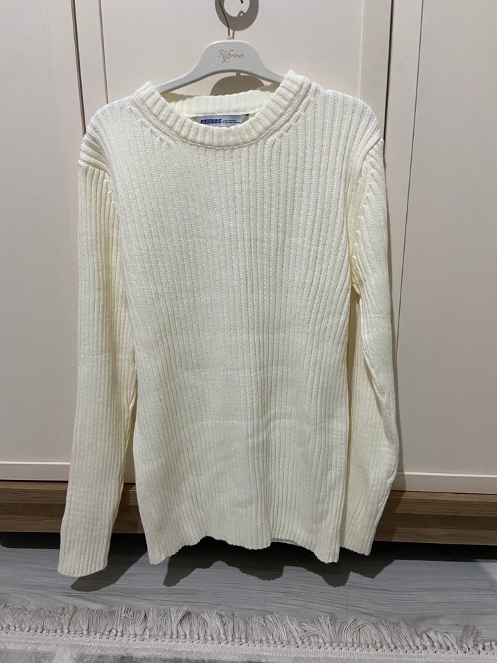 Beyaz renkli, yuvarlak yakalı ve uzun kollu triko kazak.