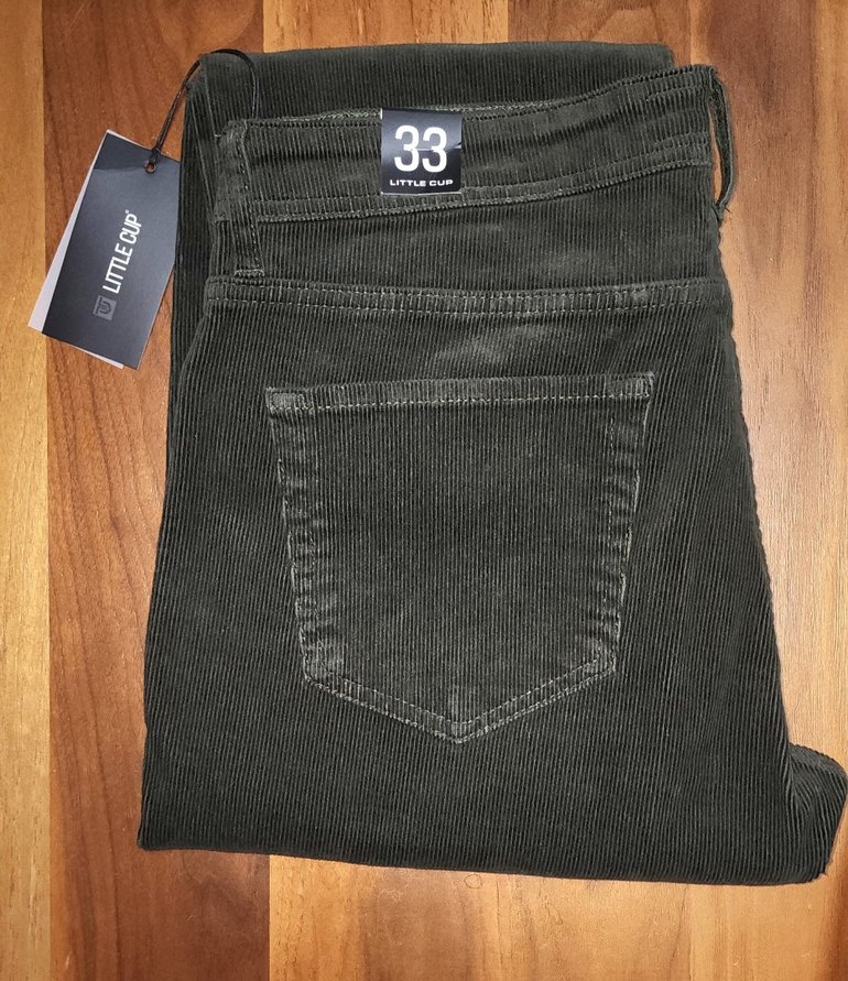 Haki renkte, düğmeli ve regular fit kesime sahip midi boy erkek kadife pantolon. Günlük sokak stili için uygundur.