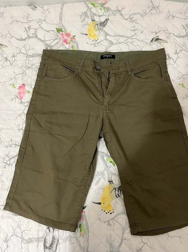Sentetik kumaştan, kemerli, desen içermeyen, bol kesim haki renk kısa erkek şortu, günlük rahat sokak stili için uygundur. Haki yeşili sorunsuz erkek pantolonu şort\bermuda\kapri ilanda görülüp gibidir ölçüsü vardır teklifleri kabul ediyorum #şort#kapri#erkekürünü