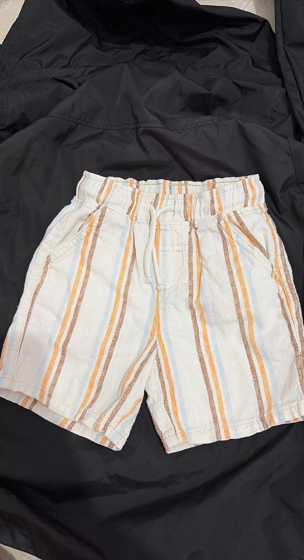 Yumuşak keten kumaştan yapılmış, bej çizgili ve pile detaylı, bol kesim erkek şort. Rahat ve bohem tarz için uygundur.