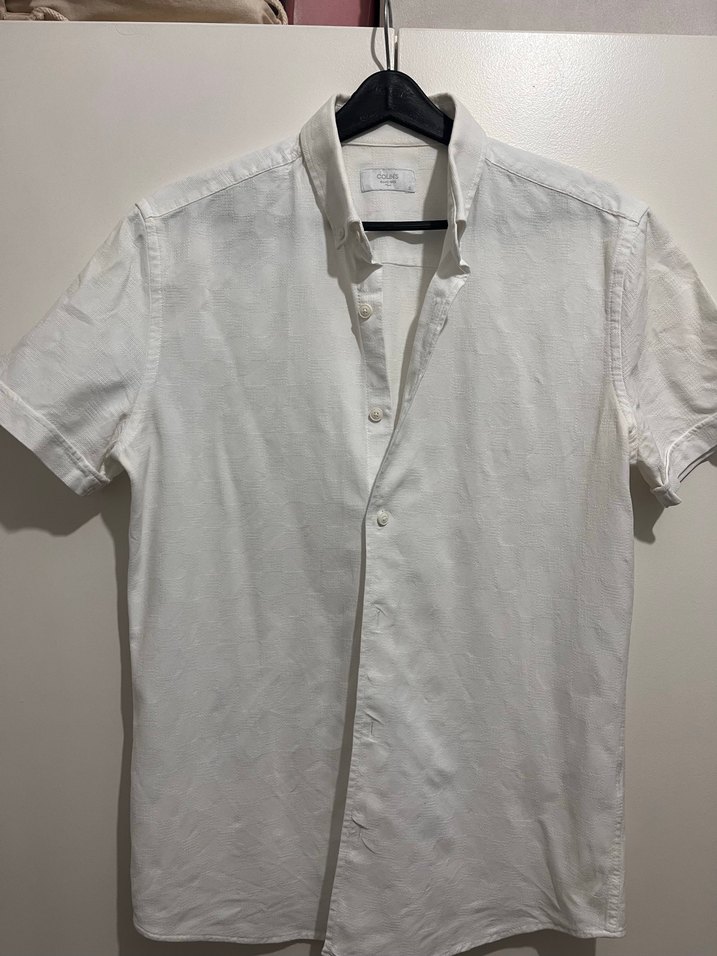 Erkek keten kumaştan, kısa kollu, yakalı ve düğmeli beyaz gömlek. Normal kesim ve desen içermeyen tasarım, günlük kullanım için uygundur.