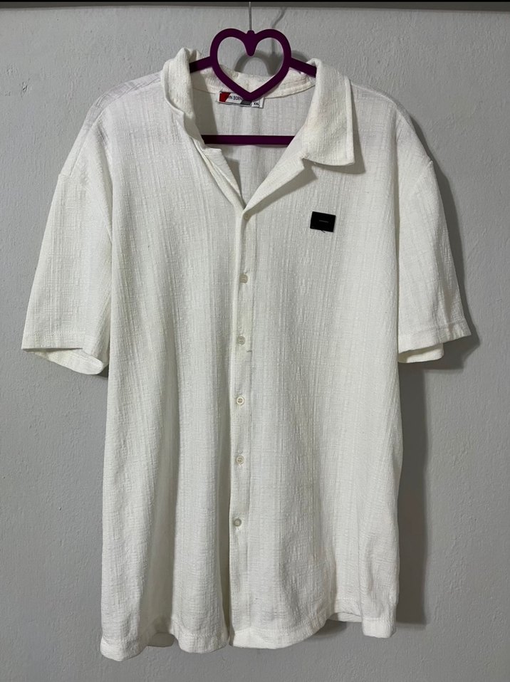 Erkekler için beyaz keten gömlek, kısa kollu ve düğmeli. Rahat kesimli, normal boyda ve gündelik kullanım için uygundur. Yumuşak dokusu ve pastel tonu rahat bir stil sunar.