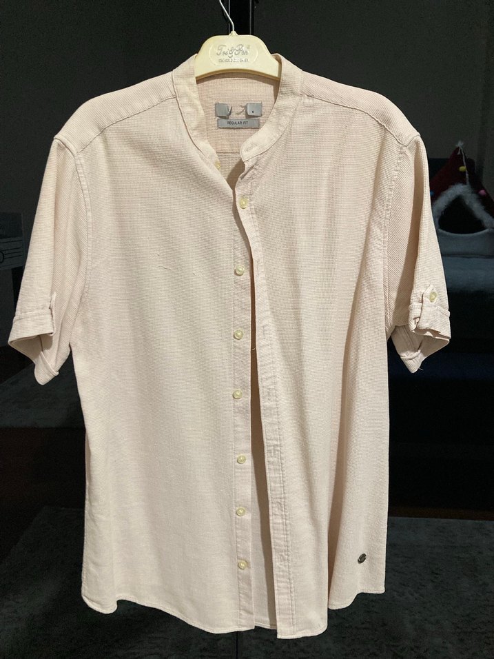 Erkek keten kumaştan, düğmeli kısa kollu beyaz gömlek. Salaş kesimi ve yakalı tasarımıyla günlük rahat sokak stiline uygundur. Pastel tonlarda, desensizdir. Bazı yerlerinde ufak tefek tüylenmeler mevcut