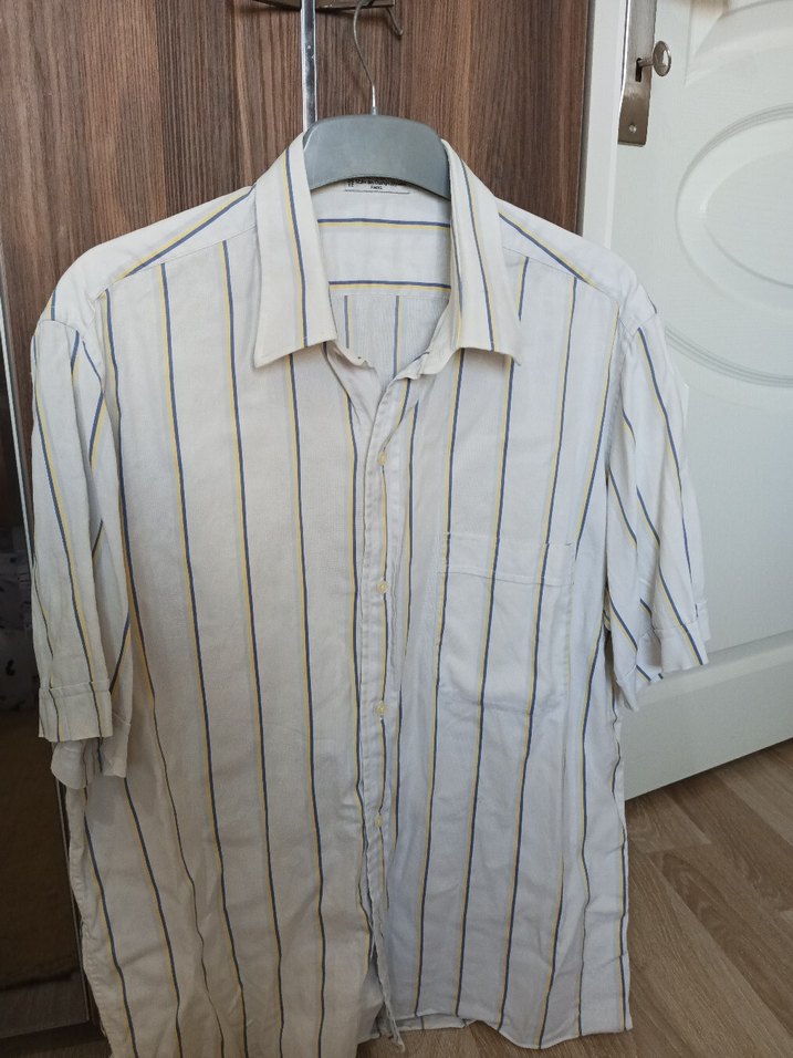 Erkek keten gömlek, kısa kollu ve düğmeli. Beyaz zemin üzerine ince gri çizgilerle, bol kesim ve normal midi boyda, günlük rahat stil için uygundur.